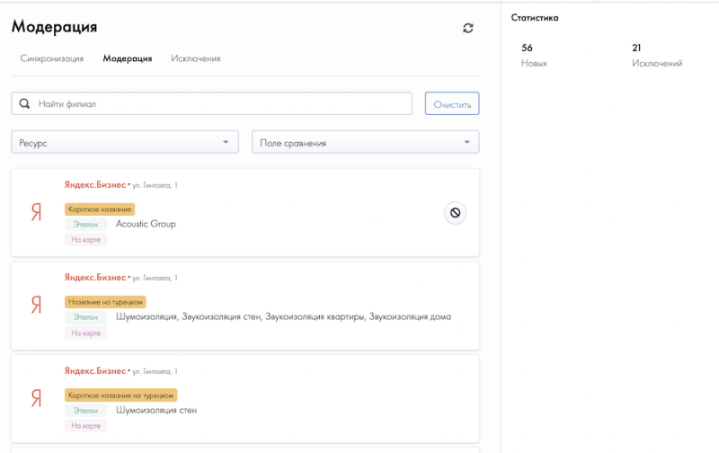 Но как же отвечать на отзывы на сотне площадок и ничего не упустить? Тут мы так же пользуемся очень удобным сервисом для работы с отзывами. Он позволяет отслеживать отзывы со всех карт и работать с негативом в едином окне. Ни один отзыв не останется без ответа.