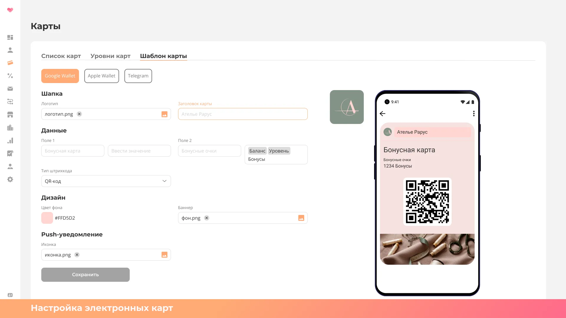 - Подключить электронные карты для Apple Wallet и Google Pay, которые можно брендировать и отображать баланс бонусов для клиентов.
