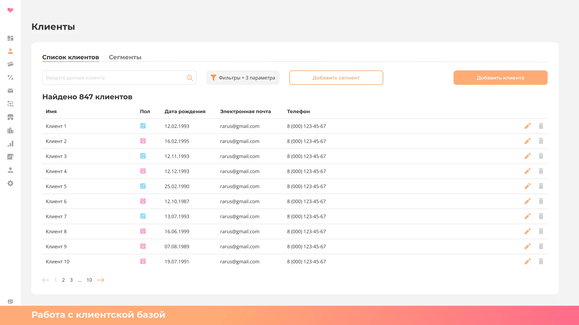 - Вести клиентскую базу: хранить имена, контакты, даты рождения и истории покупок. Сегментировать клиентов по полу и возрасту, покупкам, уровню карт и другим признакам.