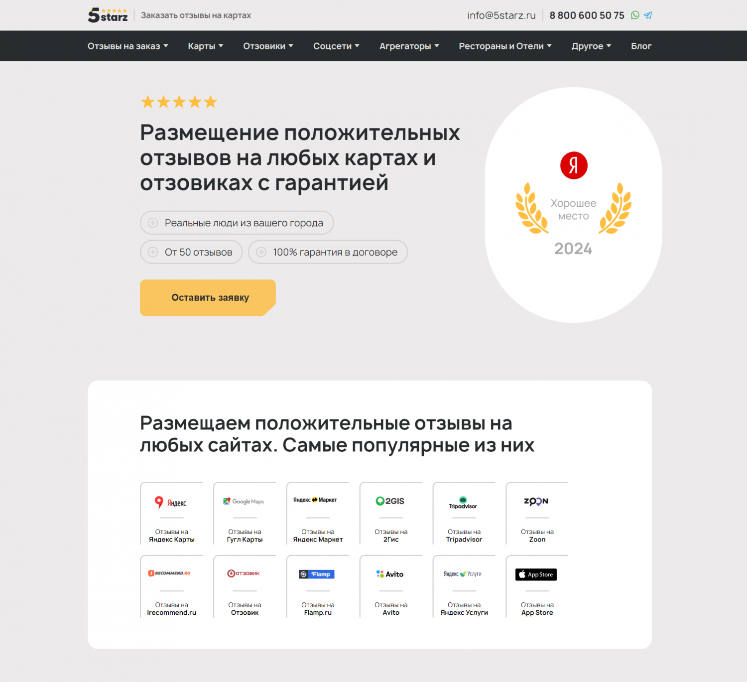 5starz — сервис для размещение положительных отзывов на любых картах и отзовиках с гарантией. Увеличение продаж путём создания безупречной репутации в интернет пространстве. Спокойное прохождение модерации без последующего удаления отзывов.