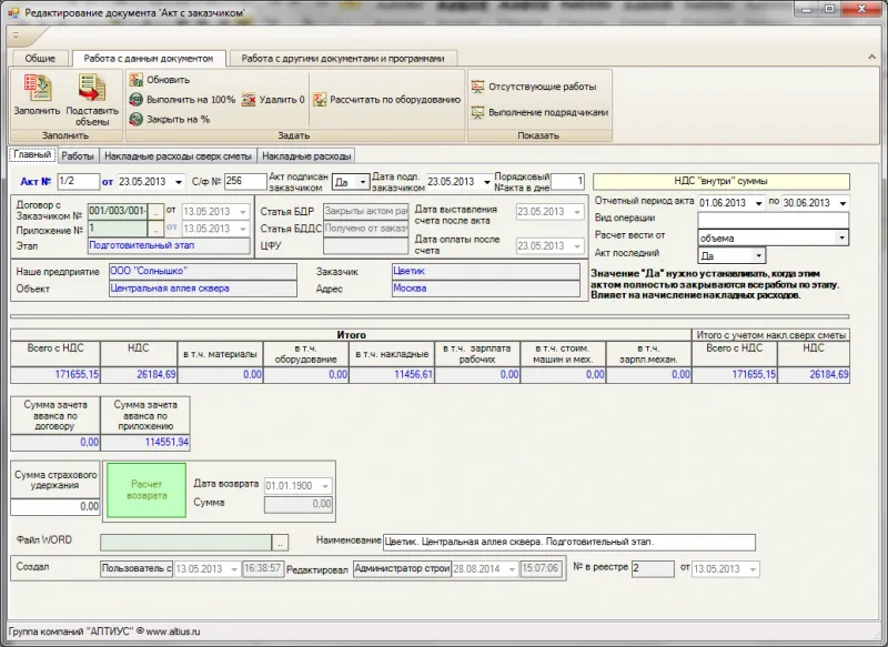 - Учитывать фактическое выполнение работ с заказчиком и подрядчиком.