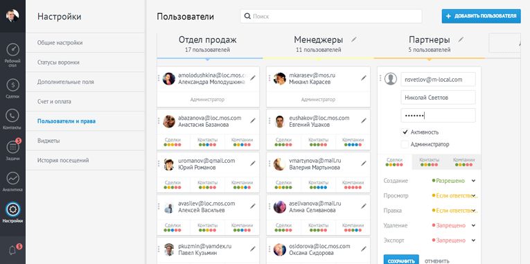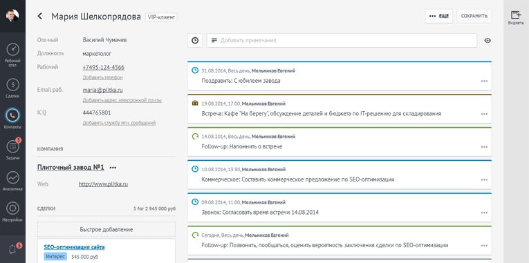 Система позволяет контролировать работу менеджеров, фиксировать все заявки и запросы клиентов, вести учёт всех сделок компании, клиентов и продаж