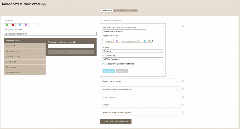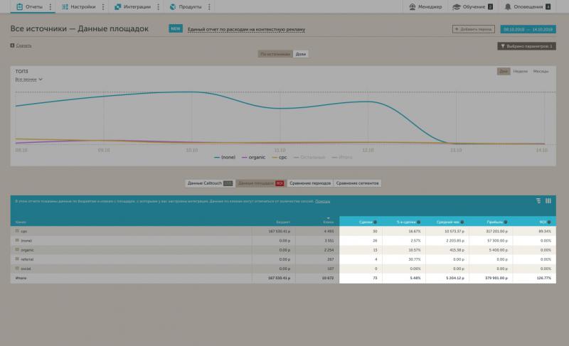 Автоматически собирает информацию со всех источников: рекламные площадки, системы аналитики, CRM-системы и связывает с данными вашего сайте . Позволяет сравнить эффективность каналов рекламы и кампаний, объявлений и ключевых фраз, определить, какой рекламный канал приносит обращения, а какой только расходует бюджет на рекламу.