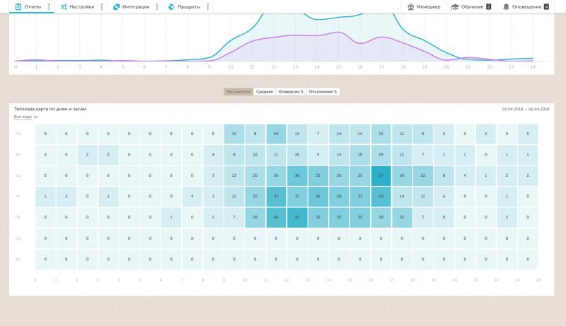 - Отчет по активности по времени суток и дням показывает, в какие часы и дни недели чаще и больше обращаются посетители и позволяет оптимизировать работу колл-центра.