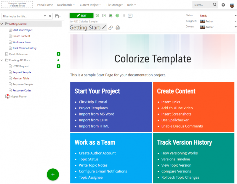 ClickHelp — это облачное решение для создания и размещения баз знаний, справочных руководств, файлов справки и так далее. Система предоставляет как среду для совместной работы над документацией (статусы, назначения, оповещения, история правок и так далее), так и платформу для публикации готового контента. При регистрации появляется собственный портал документации, в который можно войти из любого браузера и начать писать документацию.