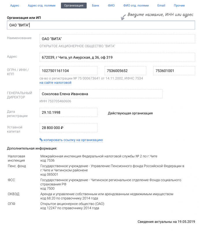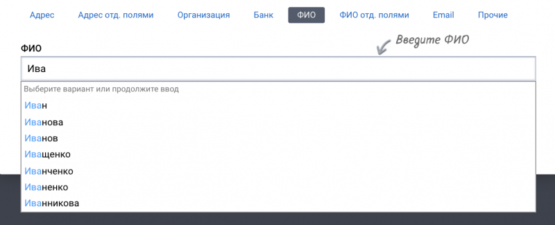 DaData.ru — сервис обработки базы контактов: адреса, ФИО, телефоны, реквизиты юрлиц, который дополняет их открытыми данными, вычищает опечатки и дубли. Помогает быстро и без ошибок заполнять формы: вводить почтовые адреса, ФИО, емейлы, реквизиты организаций и банков. Готовит базу клиентов для рассылок и обзвонов, курьерской доставки и отчетов. Сервис стандартизации принимает контактные данные, чистит их и насыщает информацией. Например: