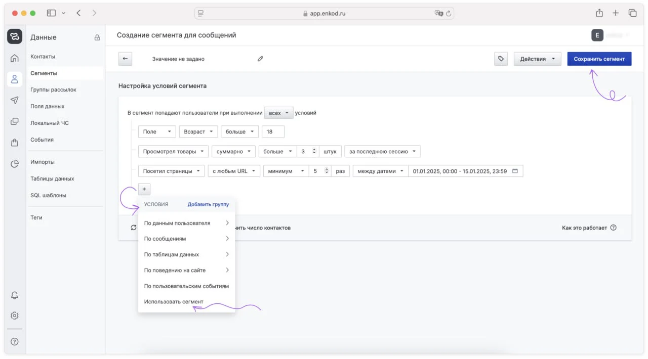 - Сбор базы: собирайте контакты пользователей с помощью всплывающих окон и сегментируйте аудиторию.