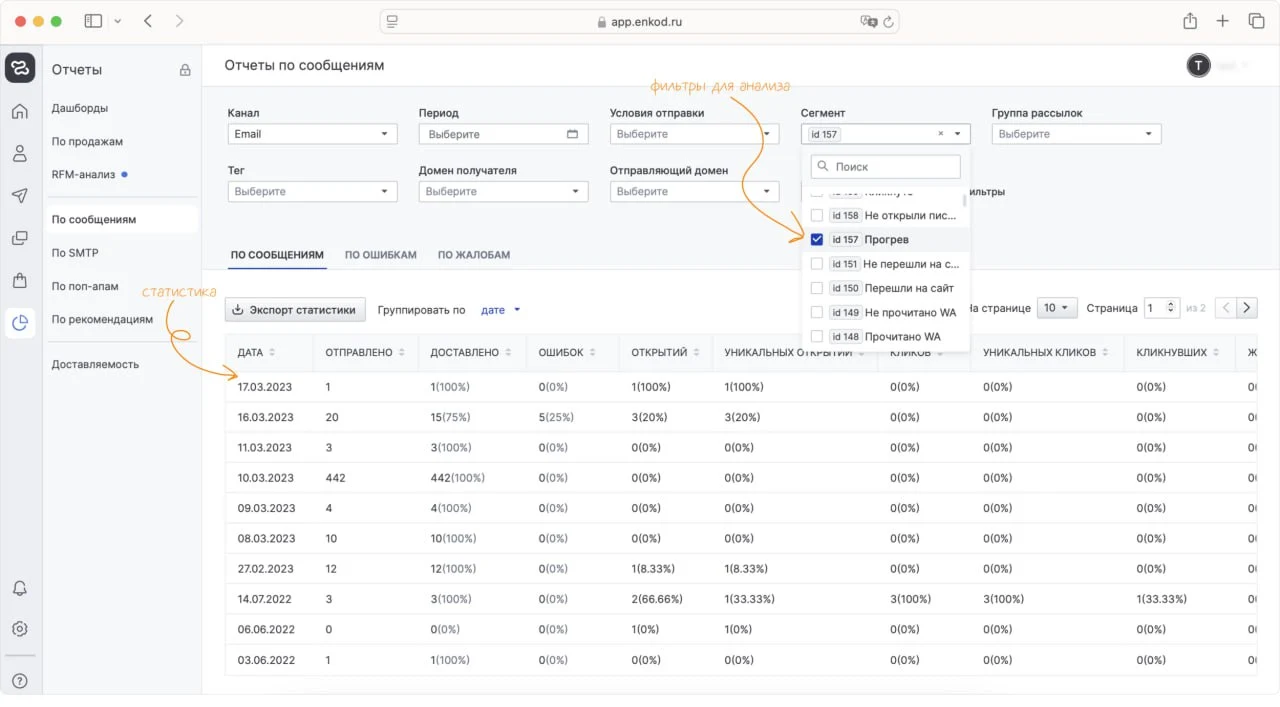 - Удобная система аналитики. Создавайте отчеты и отслеживайте эффективность каждого письма.