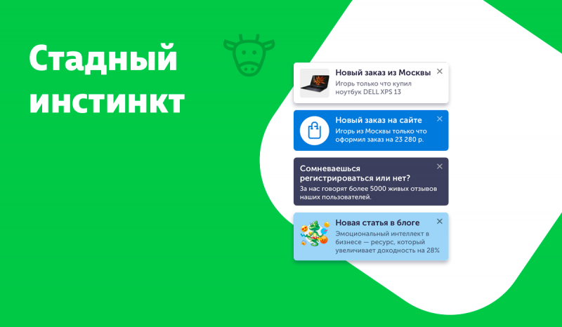 - 6. Стадный инстинкт — это виджет, создающий эффект очереди, представляет из себя всплывающее окошко, в котором выводятся заранее заготовленные тексты о том, что другие посетители сайта прямо в этот момент купили товар, оформили заказ или, например, забронировали столик.