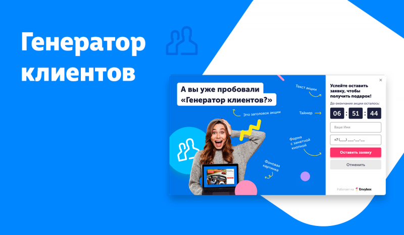 - 4. Генератор клиентов — это виджет, который генерирует заявки и звонки с сайта, за счет привлечения внимания, с помощью всплывающего окна с акцией и таймером.