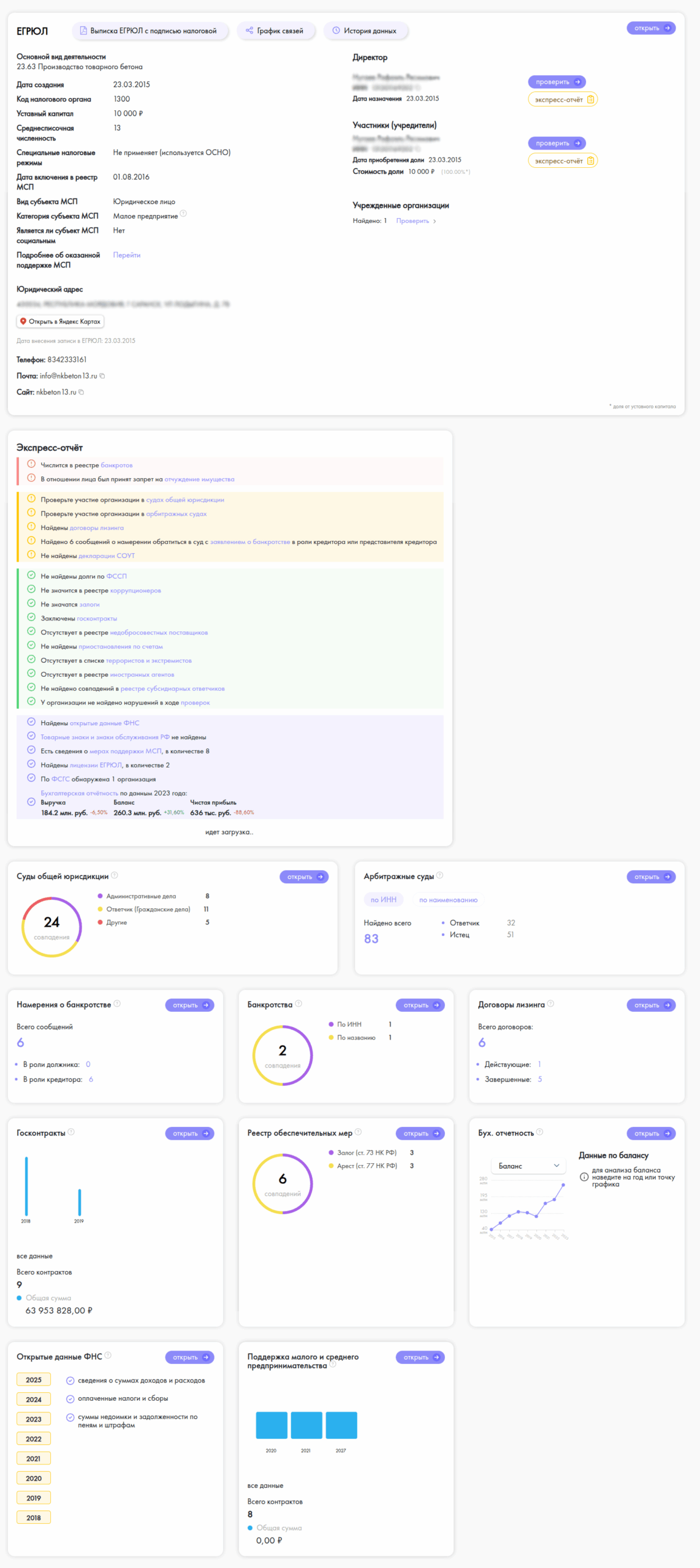 Система составит отчет за минуту в 1 клик. Выписка включает в себя классические источники проверки (ФССП, залоги, банкротство, ЕГРЮЛ и др.) и более редкие (Розыски ФСИН, МВД, ФССП; ЕГРИП; намерение о банкротстве и др.). Также в поиске участвуют суды общей юрисдикции с 2005 по 2025 гг.: уголовные, гражданские, административные и иные дела. Маячки в отчете обращают внимание на неочевидные риски. Поиск идет по всем регионам РФ.