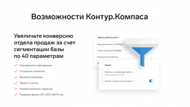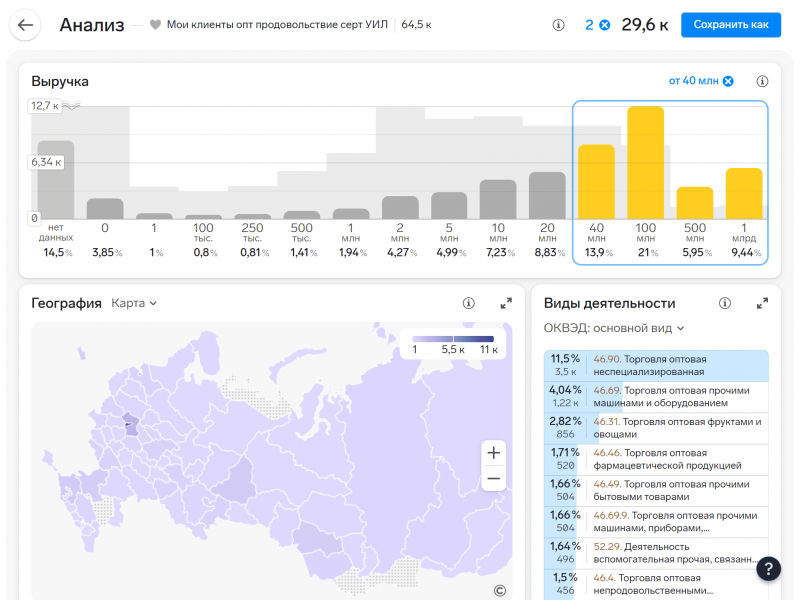 Честно говоря, готовые клиентские базы это еще та головная боль. Потратил деньги, а половина базы вообще не наша целевая аудитория. вообще не понятно за что заплатил. Поэтому теперь собираю базы сам с помощью Контур Компас и хочу сказать сервис максимально крутой в плане функционала. Чтобы собрать подходящую базу выставил поиск по словам в лицензиях, отметил другие фильтры и через несколько минут уже всё выгружено в CRM.