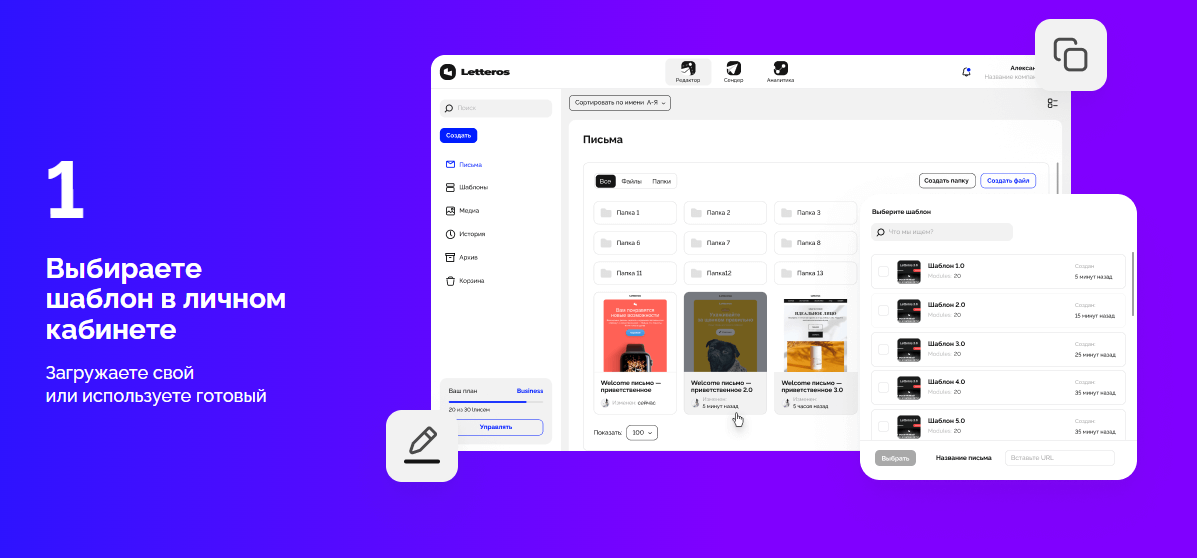 Letteros — сервис для создания шаблонов и дизайна писем для рассылки. При помощи Letteros компании могут создавать информационные письма, опросы, промо-рассылки, активационные письма и другие. Сервис помогает автоматизировать процесс создания писем и их вёрстку, сократив время на разработку.