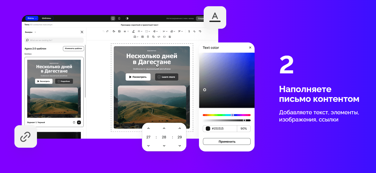 Для создания макета письма в Letteros не нужно привлекать разработчика, письмо может собрать человек, разбирающийся в email-маркетинге. Создание писем происходит в конструкторе. Письмо можно создавать с нуля или используя готовые шаблоны. Конструктор-писем в Letteros использует блочный дизайн. Блоки могут содержать в себе текст, изображения, видео, таймеры обратного отсчёта, nps-блоки и другие интерактивные элементы. Внутри блоков можно изменять стили, подобрать шрифты и цвета, вставить UTM-метки. У писем, созданных в Letteros, можно проверить текст и ссылки на ошибки.