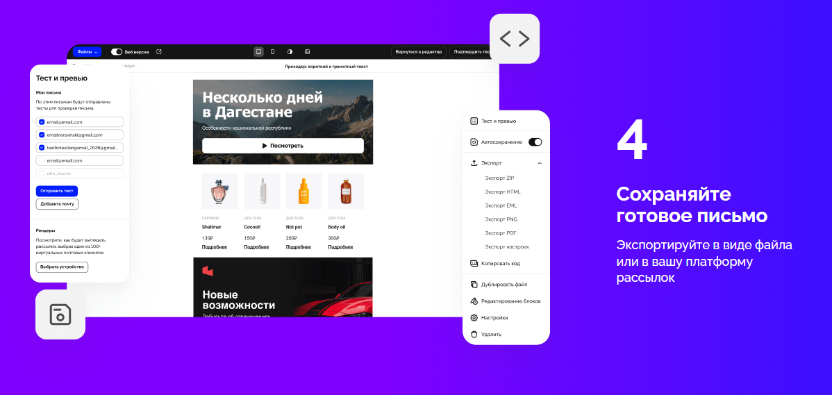 - Импорт и экспорт шаблона в HTML, EML, ZIP