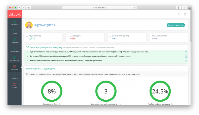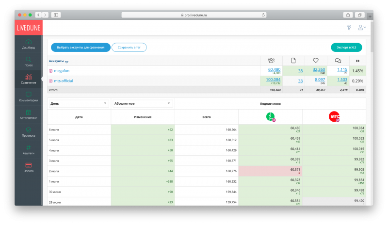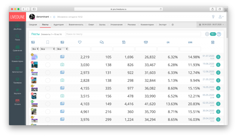 LiveDune — это сервис аналитики соцсетей своих и чужих аккаунтов (конкурентов или блогеров).