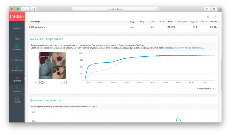 В базе данных сервиса порядка 150 миллионов аккаунтов различных соцсетей, информация о которых постоянно обновляется в фоновом режиме. Это позволяет анализировать множество аккаунтов в онлайн, без длительного ожидания. Cервис аналитики социальных сетей LiveDune позволяет отслеживать эффективность продвижения в соцсетях: динамика охватов, несколько показателей вовлеченности, сравнение показателей своего аккаунта с конкурентами или аккаунтами в одной категории, динамика прироста аудитории, детальный анализ контента и многое другое. А фоновый мониторинг блогеров позволяет выявить тех, кто использует накрутки лайков или подписчиков, и сэкономить драгоценный бюджет.