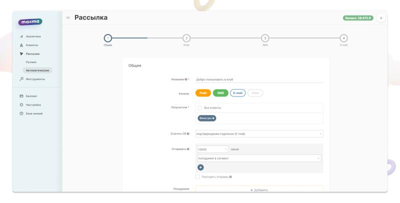 - автоматические рассылки (SMS, push, мессенджеры, e-mail)
