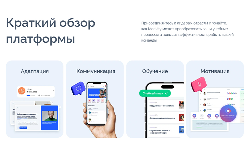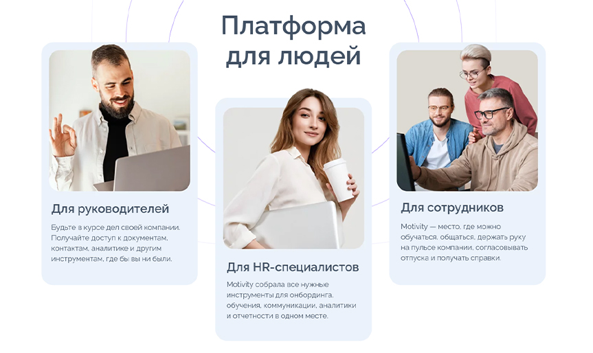 Motivity — платформа для адаптации, обучения, оценки, мотивации и общения сотрудников. Платформа включает 50+ базовых и 18 дополнительных модулей. Motivity позволяет собрать собственную HR-систему, заточенную под бизнес-процессы вашей компании. Платформа доступна на компьютере, планшете и смартфоне.