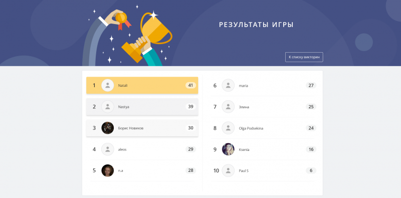 Больше не нужно выкрикивать ответы с места или вводить их в неудобную форму на сайте. После каждого вопроса участники видят, какой ответ правильный и почему, а также тех, кто лидирует. А в финале отобразится лидерборд.