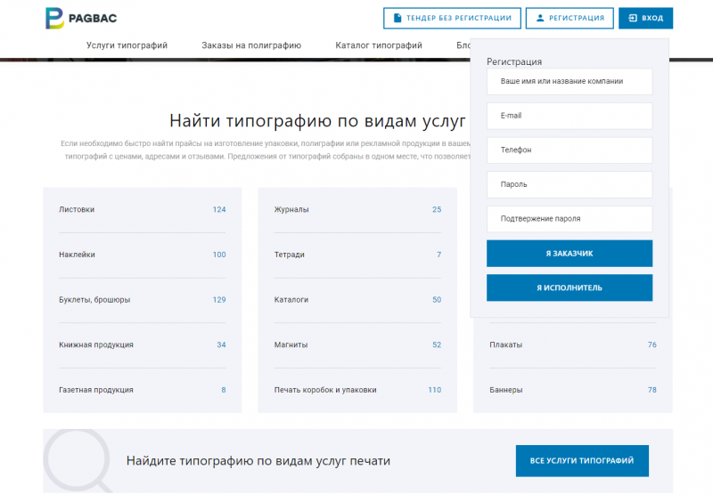 - Каталог типографий с поиском по категориям и городам