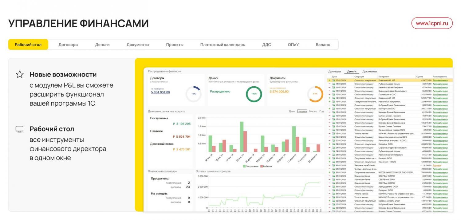 P& L для 1С:Предприятия 8 — модуль для автоматизации управленческого финансового учета не выходя из 1С. Модуль P& L легко встраивается в вашу базу 1С и позволяет вести полноценный финансовый учет без таблиц и сервисов. Инструменты модуля позволяют автоматизировать рутинные операции финансового менеджера, собирать ДДС, ОПиУ и баланс в один клик.