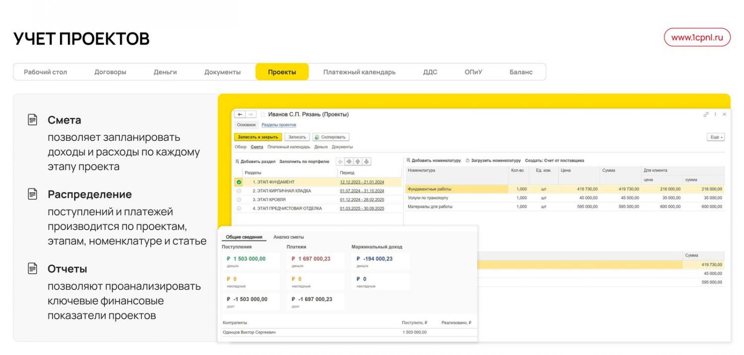 - Проекты - детализируйте финансовые потоки по проектам и их этапам.