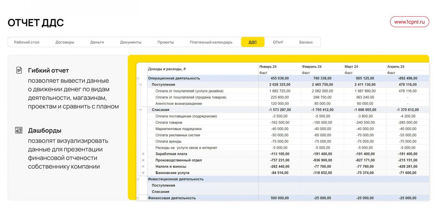 - ДДС - отчет о движении денежных средств: Покажет сколько ежедневно зарабатывает компания, расскажет куда тратятся деньги, продемонстрирует остаток на счетах, в кассе и кошельках.