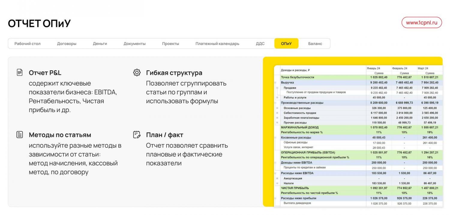 - ОПиУ - отчет о прибылях и убытках: Детально собирает доходы и расходы, рассчитывает чистую прибыль и рентабельность, покажет сколько денег можно вывести как дивиденды.