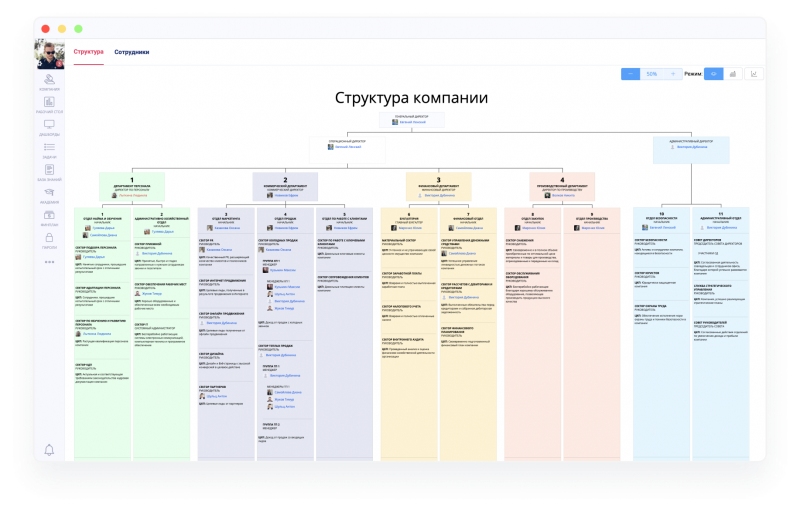 - Структура компании. Удобный конструктор структуры компании, позволяющий создать подразделения и должности.