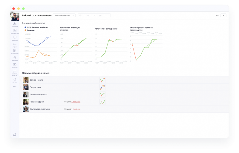 - Метрики. Возможность задать ключевые показатели сотрудников, отделов и бизнеса. Показатели выводятся в виде удобных и наглядных графиков.