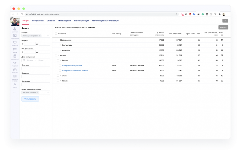 - Склад. Учет имущества и оборудования компании, инвентаризация, автоматический расчет амортизации.