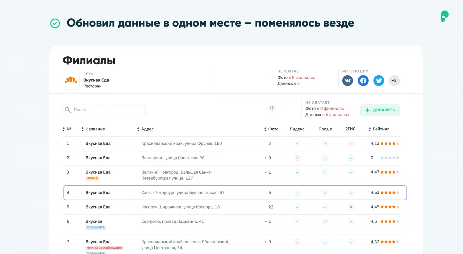 - Подключение и размещение информации о компании на 30+ платформах, представленность компании в поисковиках и на онлайн-картах Яндекса, Google, Mail.Ru, 2ГИС, в навигаторах и службах такси, каталогах и социальных сетях и др.