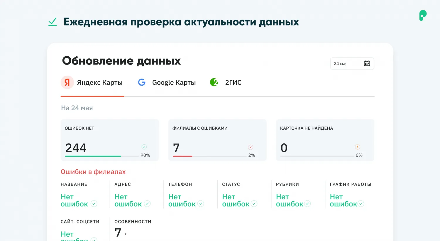 - Контроль данных и защита от изменений третьими лицами благодаря обратной проверке данных: ежедневно алгоритмы сервиса сравнивают данные, которые фактически размещены в карточках, с «эталонными» данными и выводят результат проверки в личном кабинете.