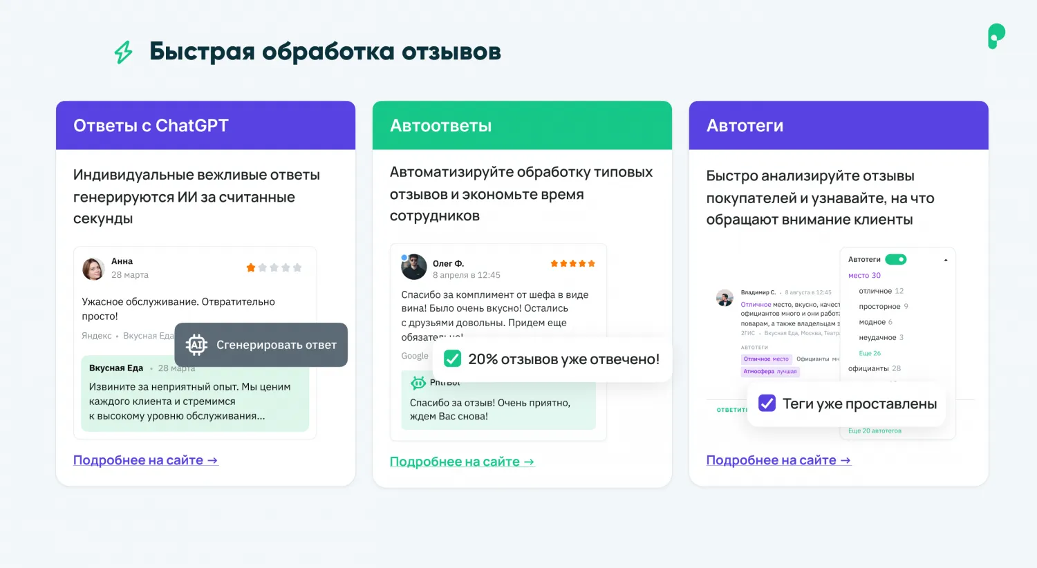 - Возможность отвечать на отзывы с помощью ChatGPT.