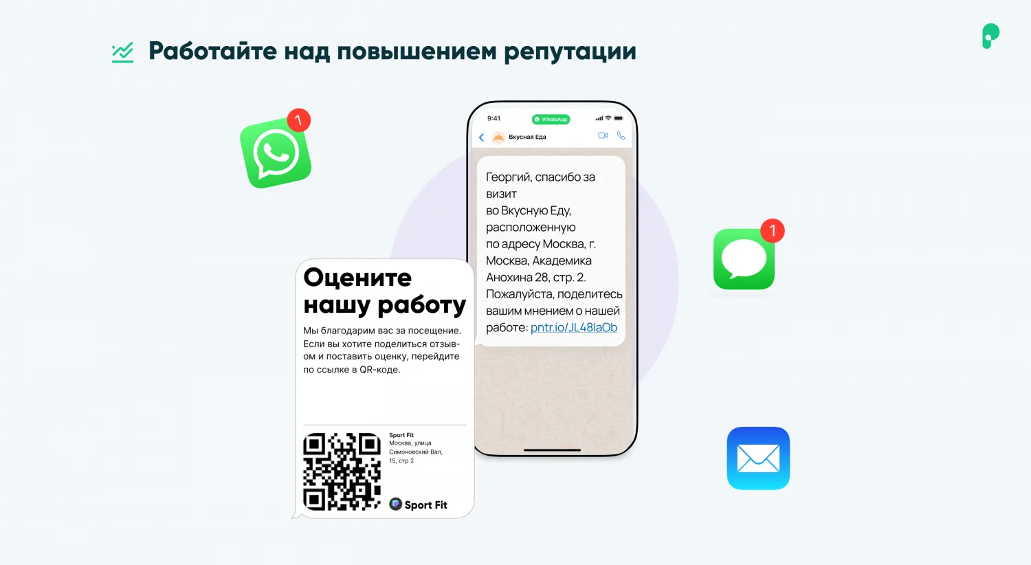 - «Активатор отзывов» для увеличения количества положительных отзывов и повышения рейтинга компании. Запрос отзыва индивидуально или с помощью рассылок по QR-коду, WhatsApp, email, SMS. Публикация положительных отзывов в онлайне и обработка негативных в личном кабинете Поинтера.