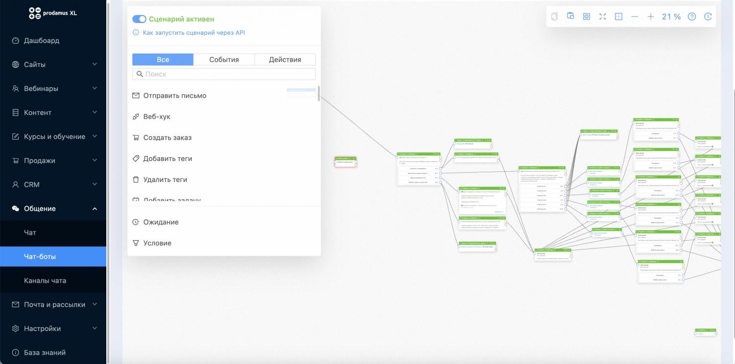 - Удобный конструктор сценариев и чат-ботов со встроенным ИИ.