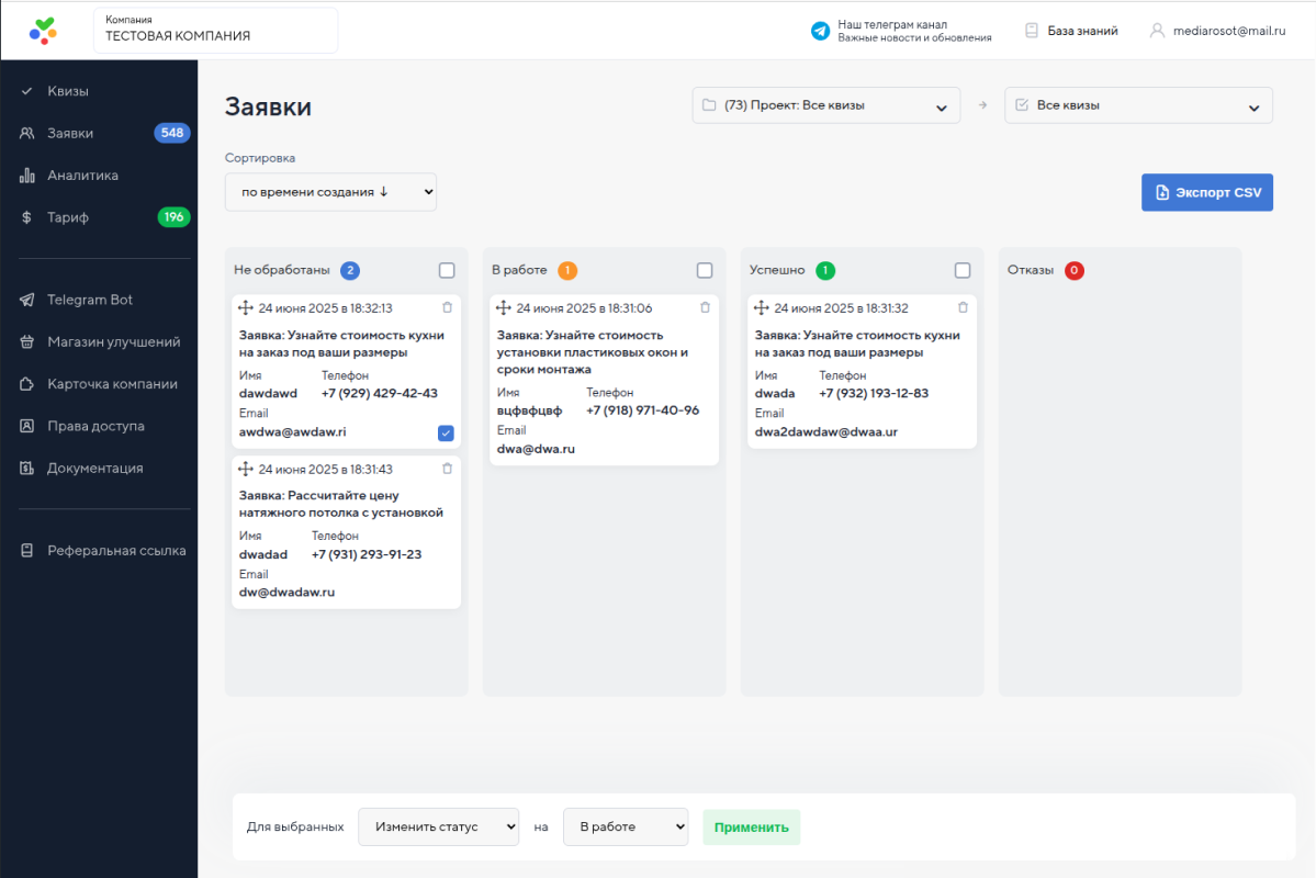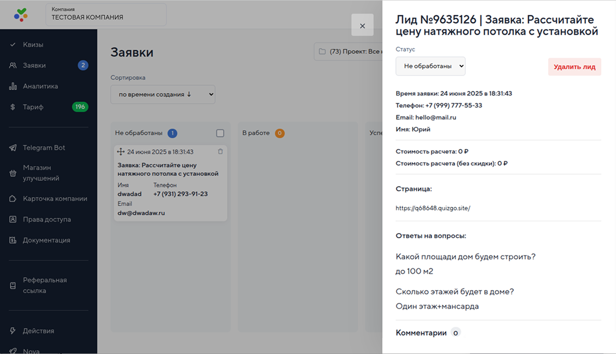 Сервис предоставляет внутреннюю CRM-систему для обработки заявок из квизов, подробную документацию, быструю техподдержку 24/7 и гибкие тарифы без ограничений по лидам включай полностью бесплатный тариф.