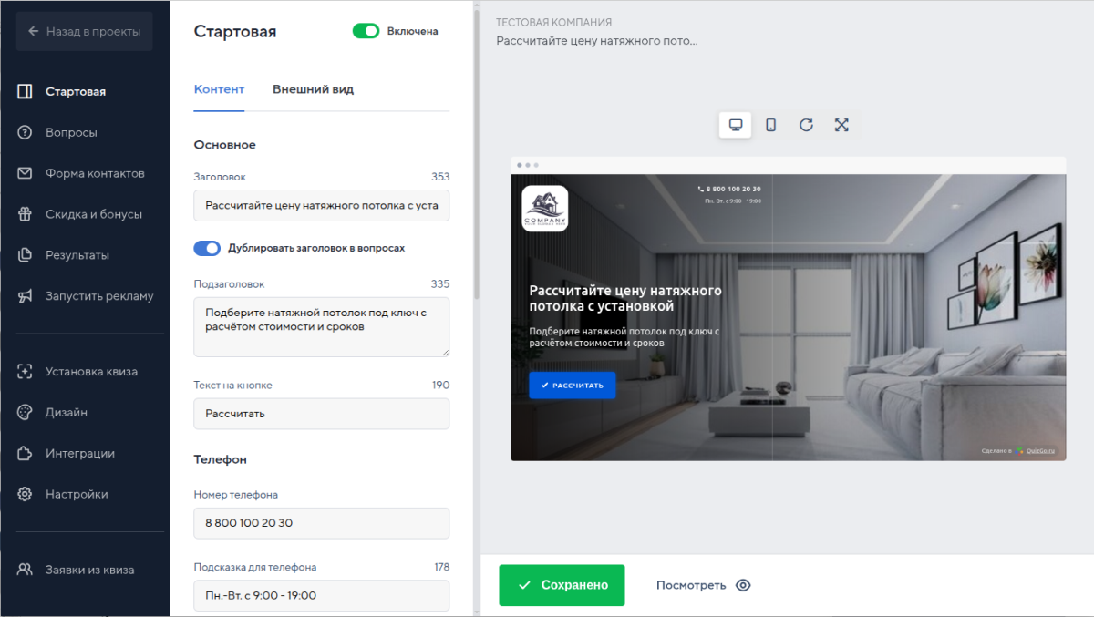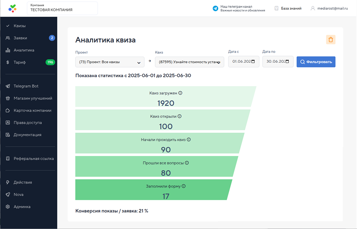 - Аналитика: Сервис предоставляет возможность отслеживать статистику прохождения квизов, что помогает оценить эффективность кампаний и оптимизировать их.