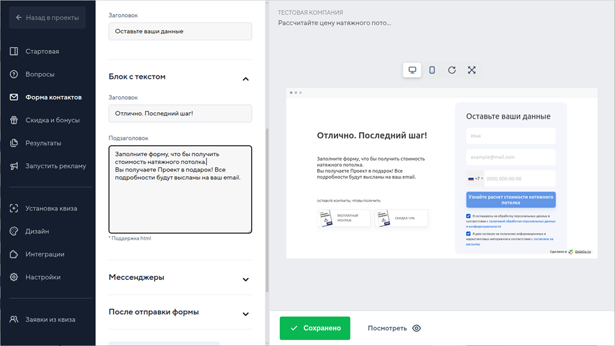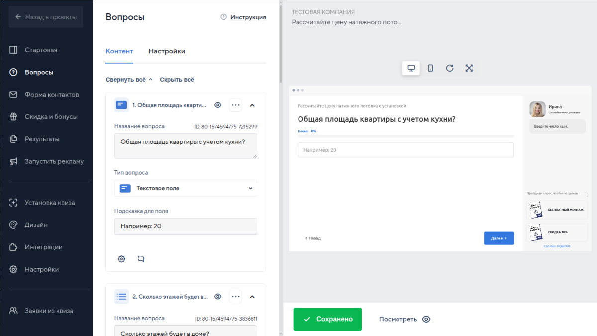 - Бонусная система: Quizgo позволяет интегрировать скидки и бонусы, стимулируя пользователей проходить квизы.