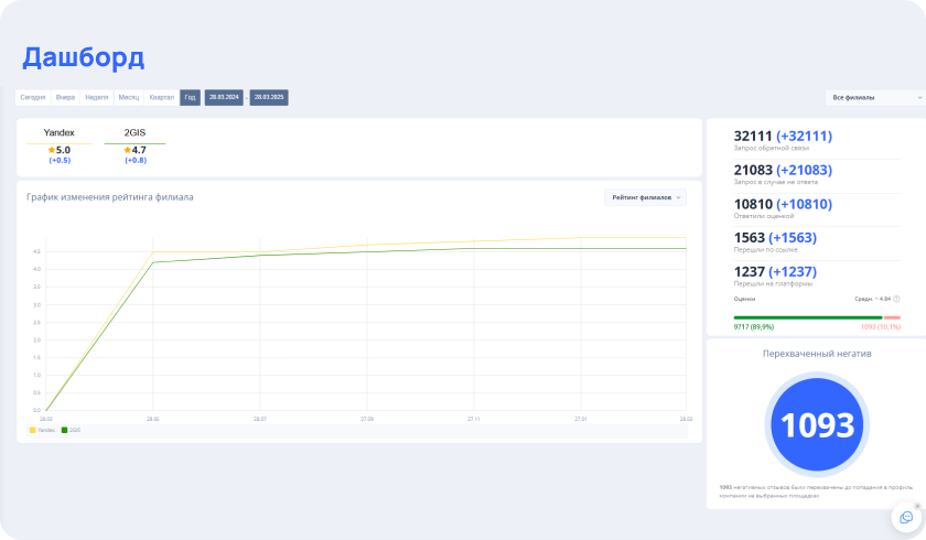 - Негативные отзывы не доходят до публикации в интернете. Сервис перехватывает их, общается с недовольным клиентом, решает проблему и сохраняет репутацию бизнеса.