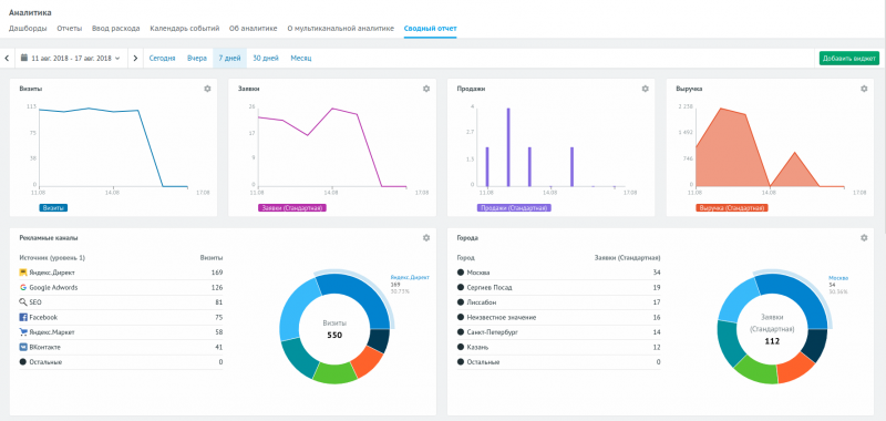 - Сквозная аналитика. Отчеты и графики по 66 бизнес-показателям, создание собственных метрик.