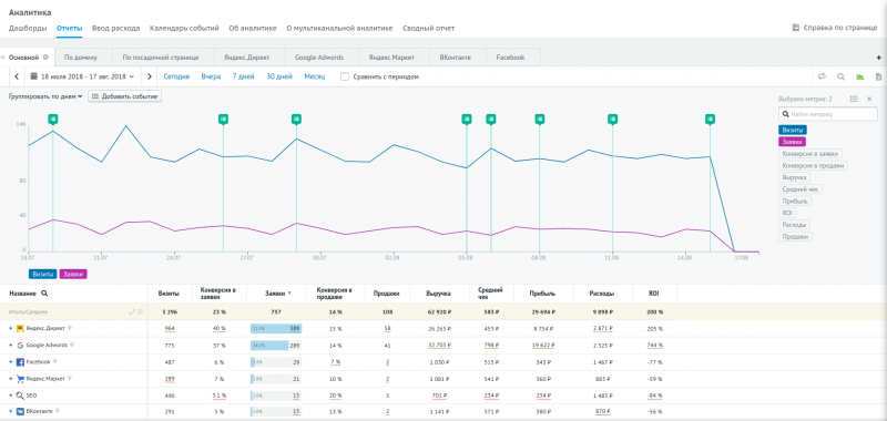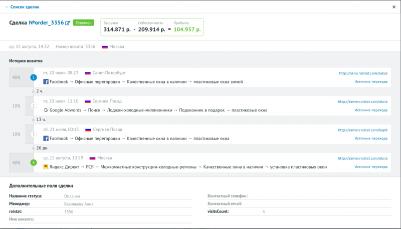 - Мультиканальная аналитика. Определение всех каналов трафика, которые участвовали в привлечении клиента, и распределение прибыли от сделки между ними.