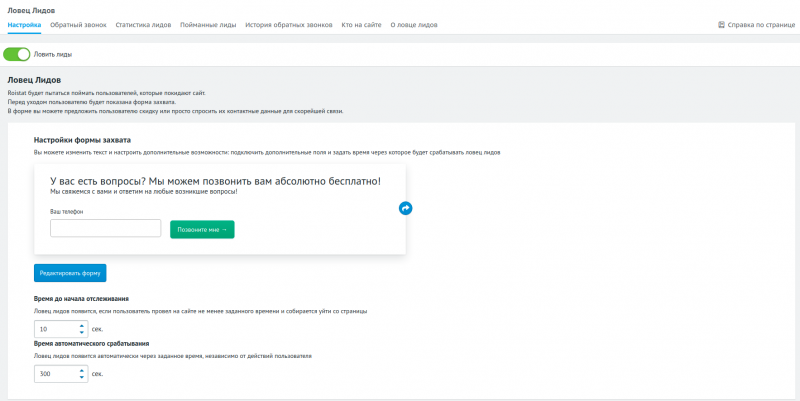 - Ловец лидов. Форма сбора контактов, которая отображается на страницах сайта через заданное время.
