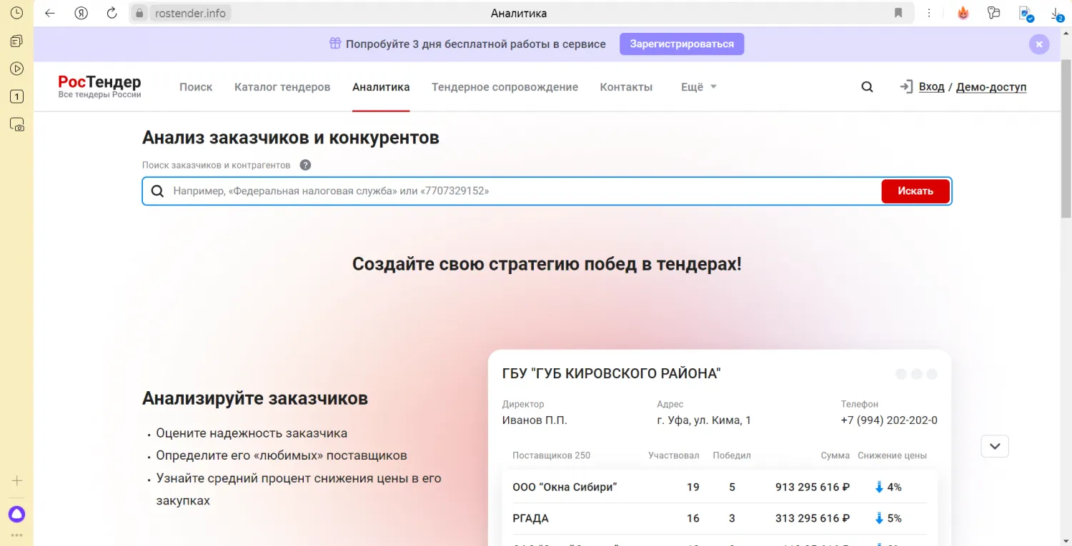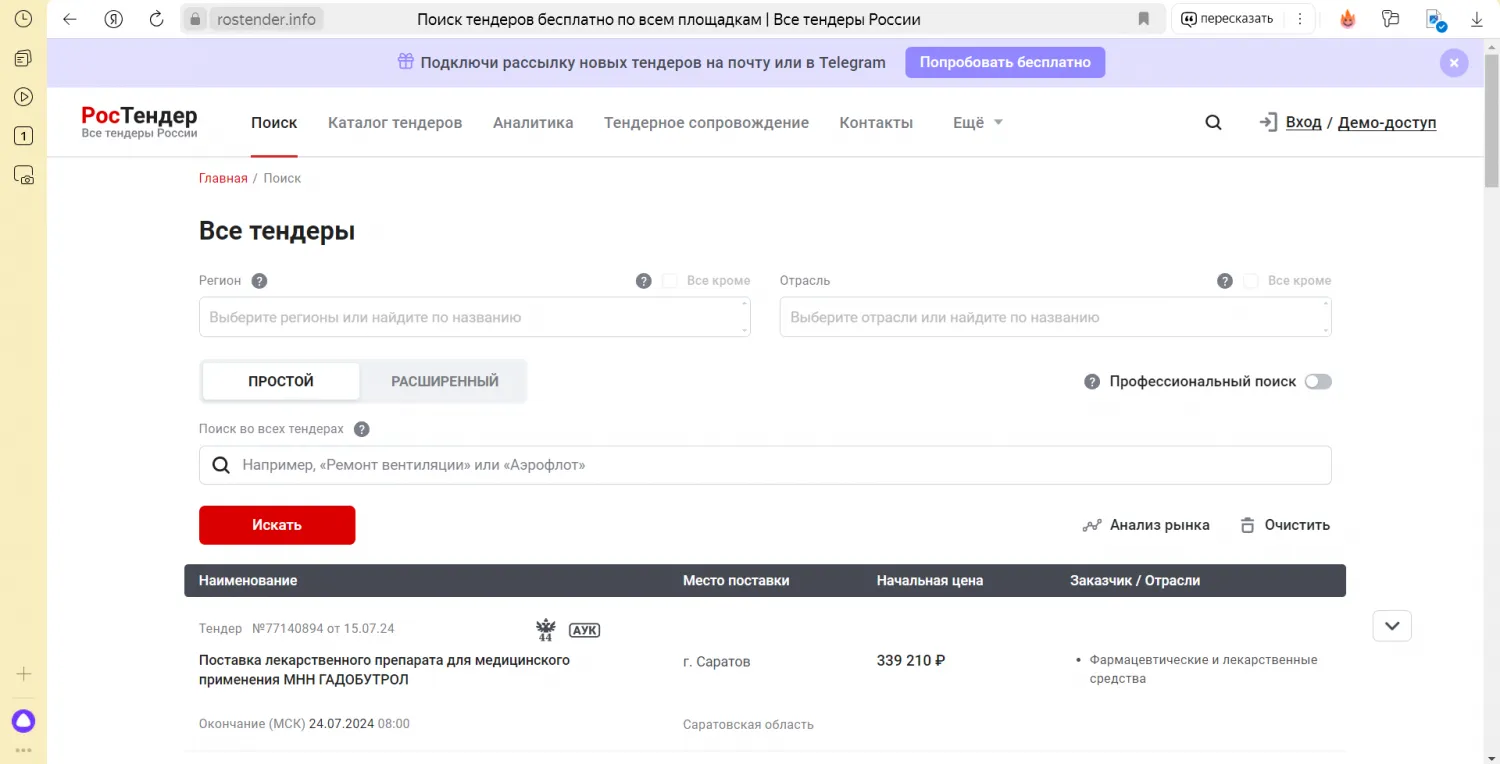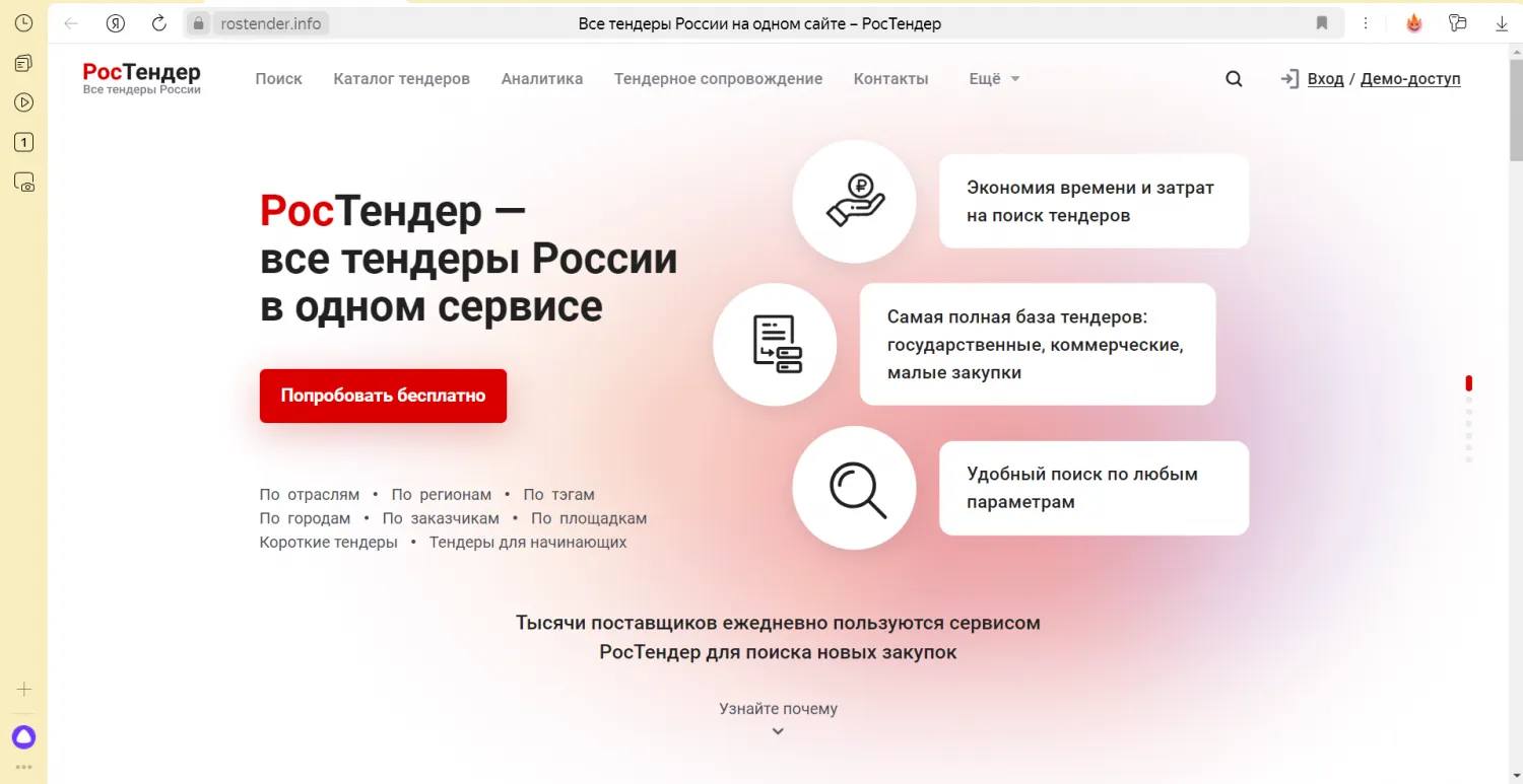 По цене отличный вариант, если работаете с тендерами. Все необходимое за свою плату есть, даже более чем:) Все продумано до мелочей - удобный интерфейс, быстрый поиск, мгновенные оповещения. Поддержка отвечает очень быстро, помогает с настройкой поисковых запросов. База тендеров регулярно обновляется, это классно, поэтому мы всегда в курсе новых контрактов, в которых мы можем участововать. Уведомления приходят быстро очень, тем более и в тг и на почту, ничего не проморгаешь. В общем, за свои деньги Ростендер дает все, что нужно для комфортной работы с тендерами.