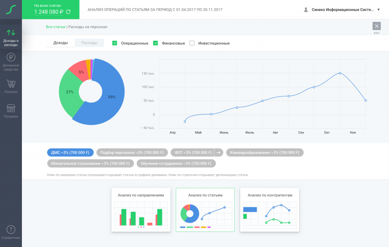 - Финансовая аналитика по статьям, клиентам, поставщикам, проектам.
