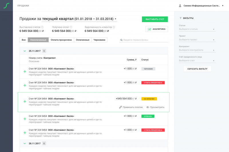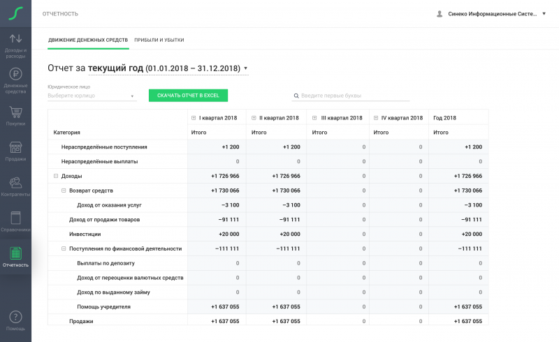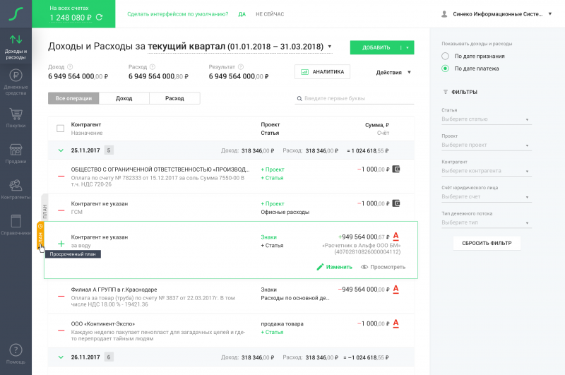 Seeneco ведет учет денег на счетах и в кассах, дает графическую аналитику (по юр. лицам, контрагентам, категориям, проектам) с детализацией до конкретного платежа, помогает вести планирование расходов и доходов, рассчитывает остатки денег на счетах в будущем, помогает вести бюджеты с план-факт. В сервисе можно формировать счета на оплату, отслеживать в онлайн-режиме их оплату, контролировать дебиторку.