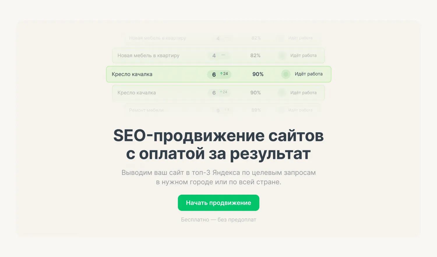 - Оплата только за результат. Бесплатно выводим сайт в топ-10 Яндекс по целевым запросам в нужном городе или по всей стране. Вы платите только за результат и поддержание сайта на высоких позициях.