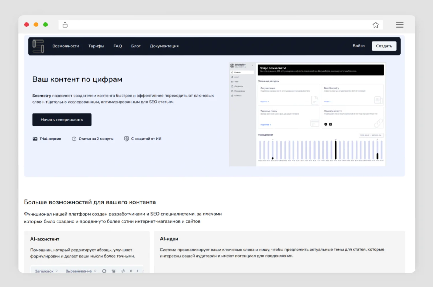 Seometry.ru — это интеллектуальная платформа, объединяющая искусственный интеллект и SEO-аналитику для масштабного создания эффективного контента.