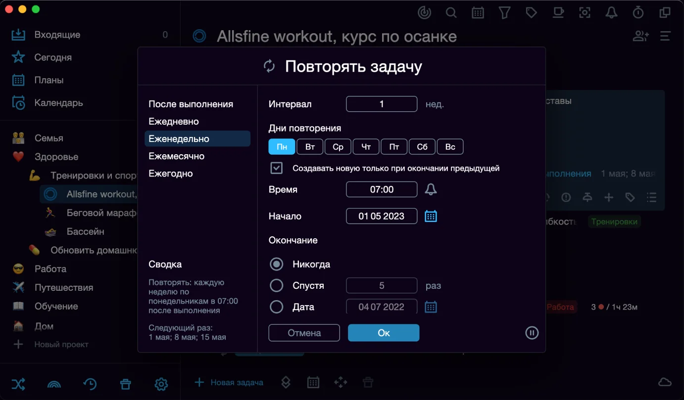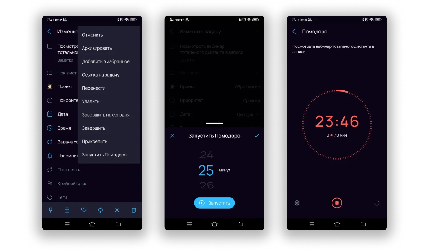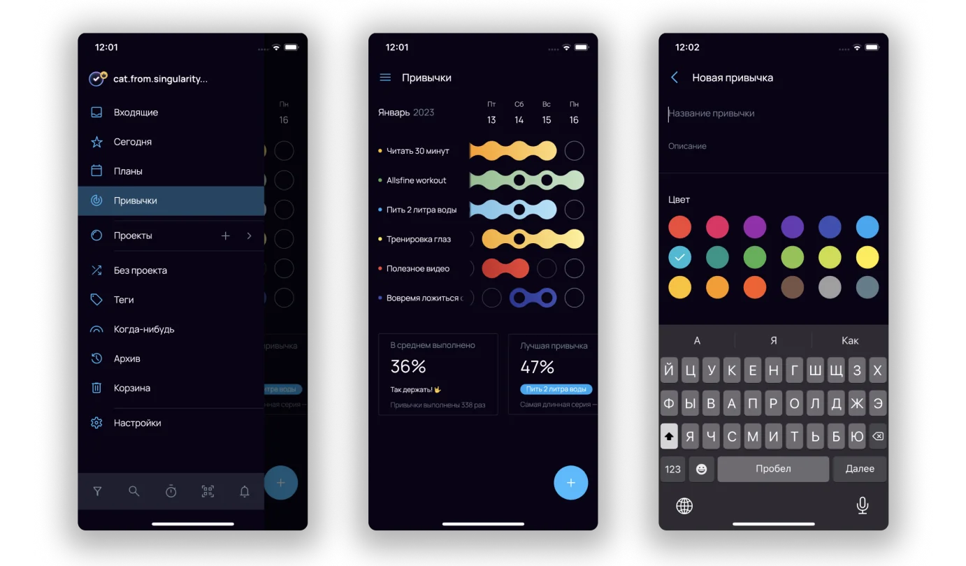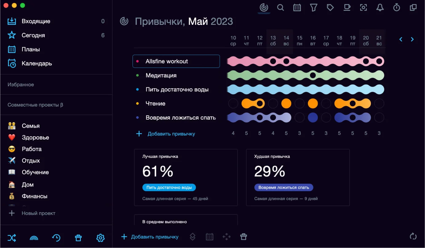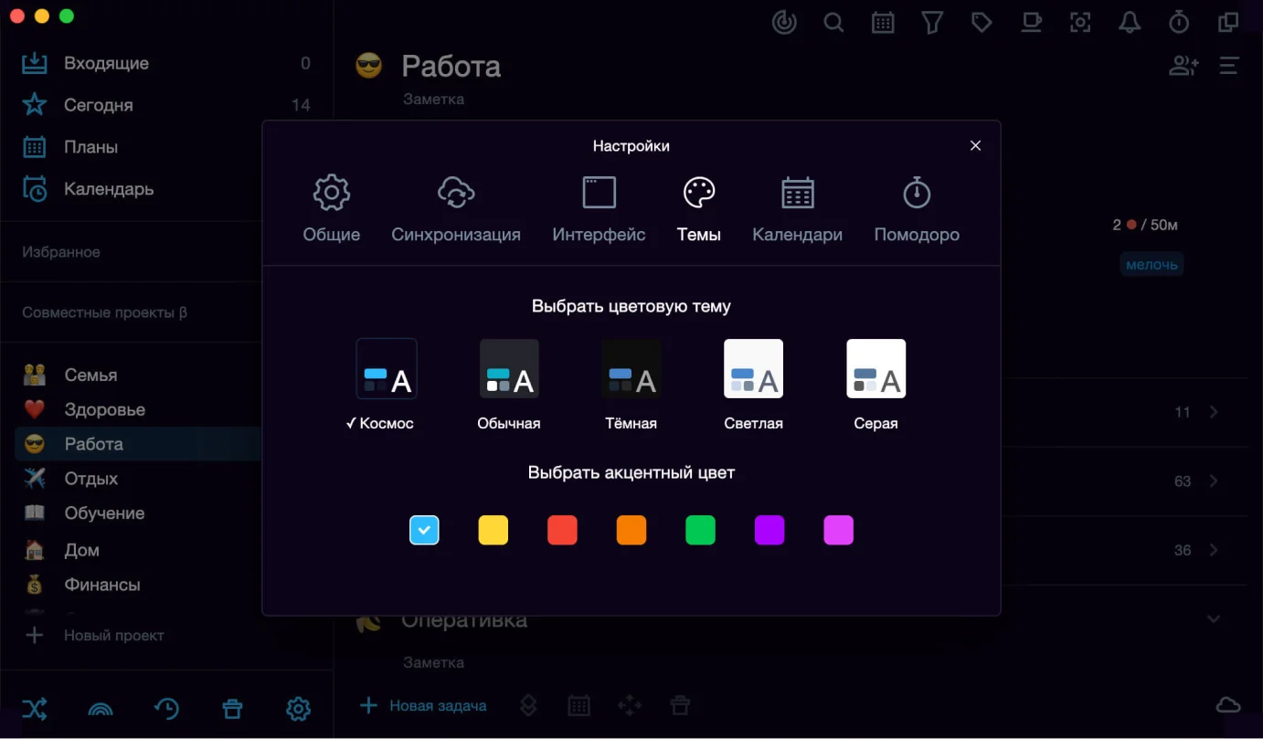 🎯 Трекер привычек, встроенный «таймер Помодоро», режимы фокусировки.
